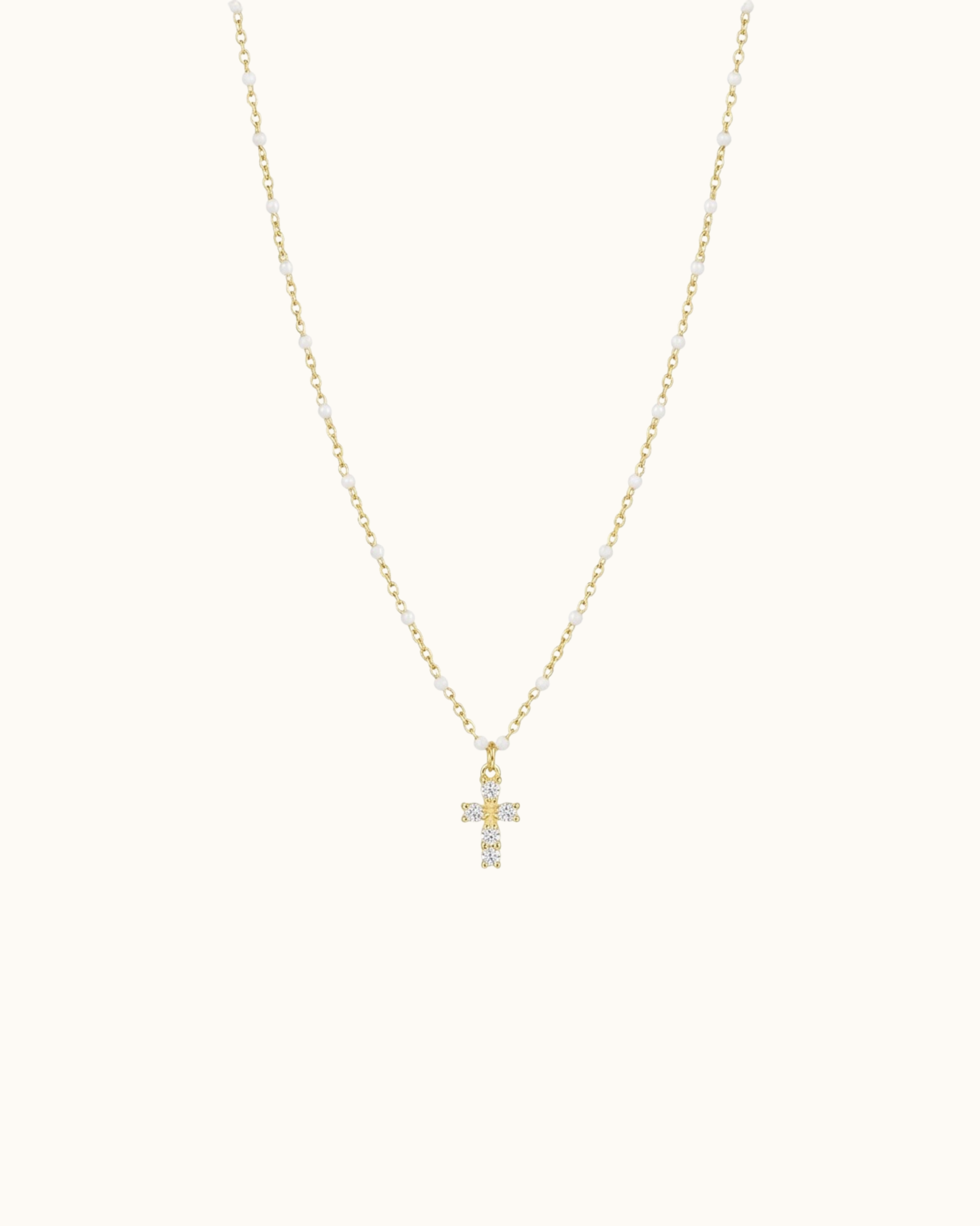 Collier à fines perles blanche ajustable avec un pendentif Croix orné de strass.