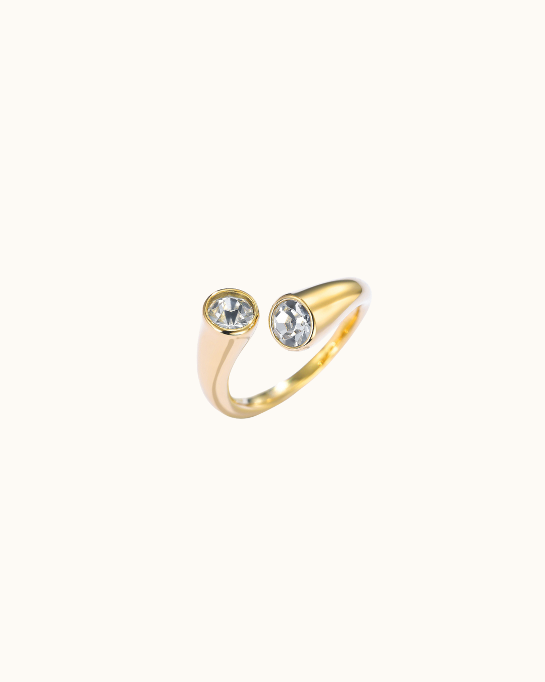 Bague ouverte dorée ornée de deux strass ronds scintillants.