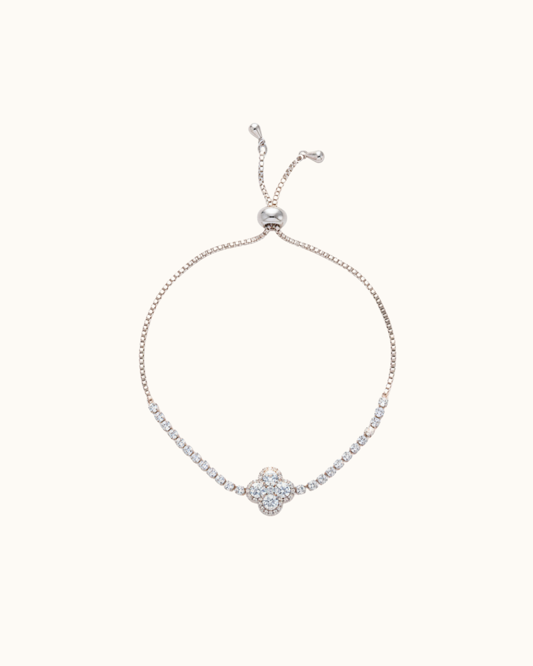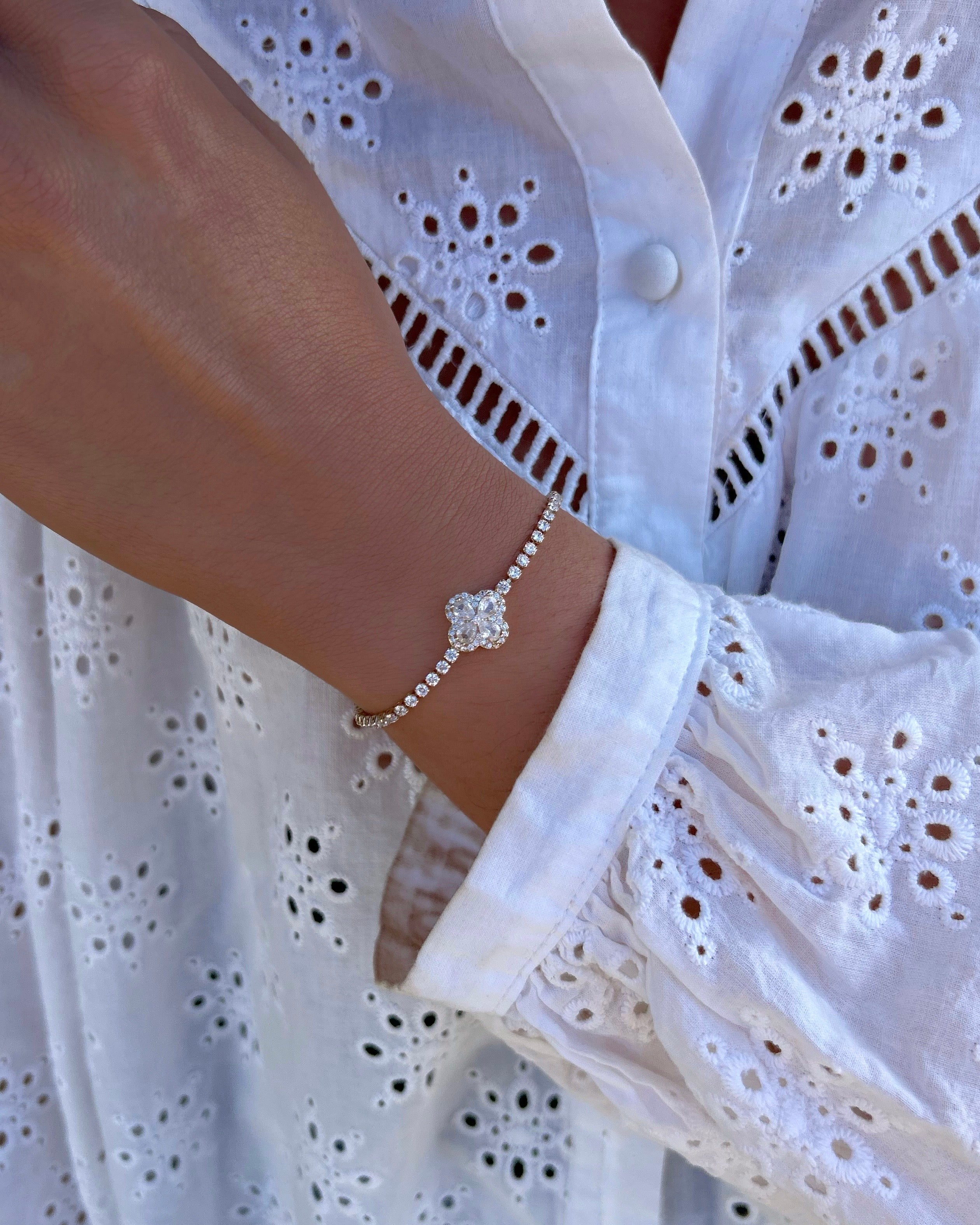 Bracelet orné de strass avec un pendentif trèfle en strass.