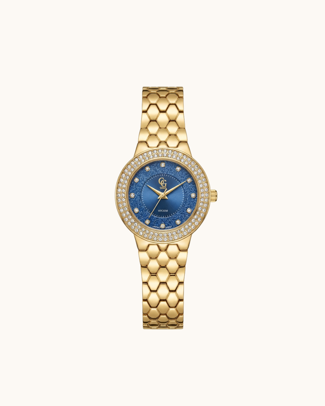 Montre ajustable dorée avec cadran serti de strass.