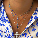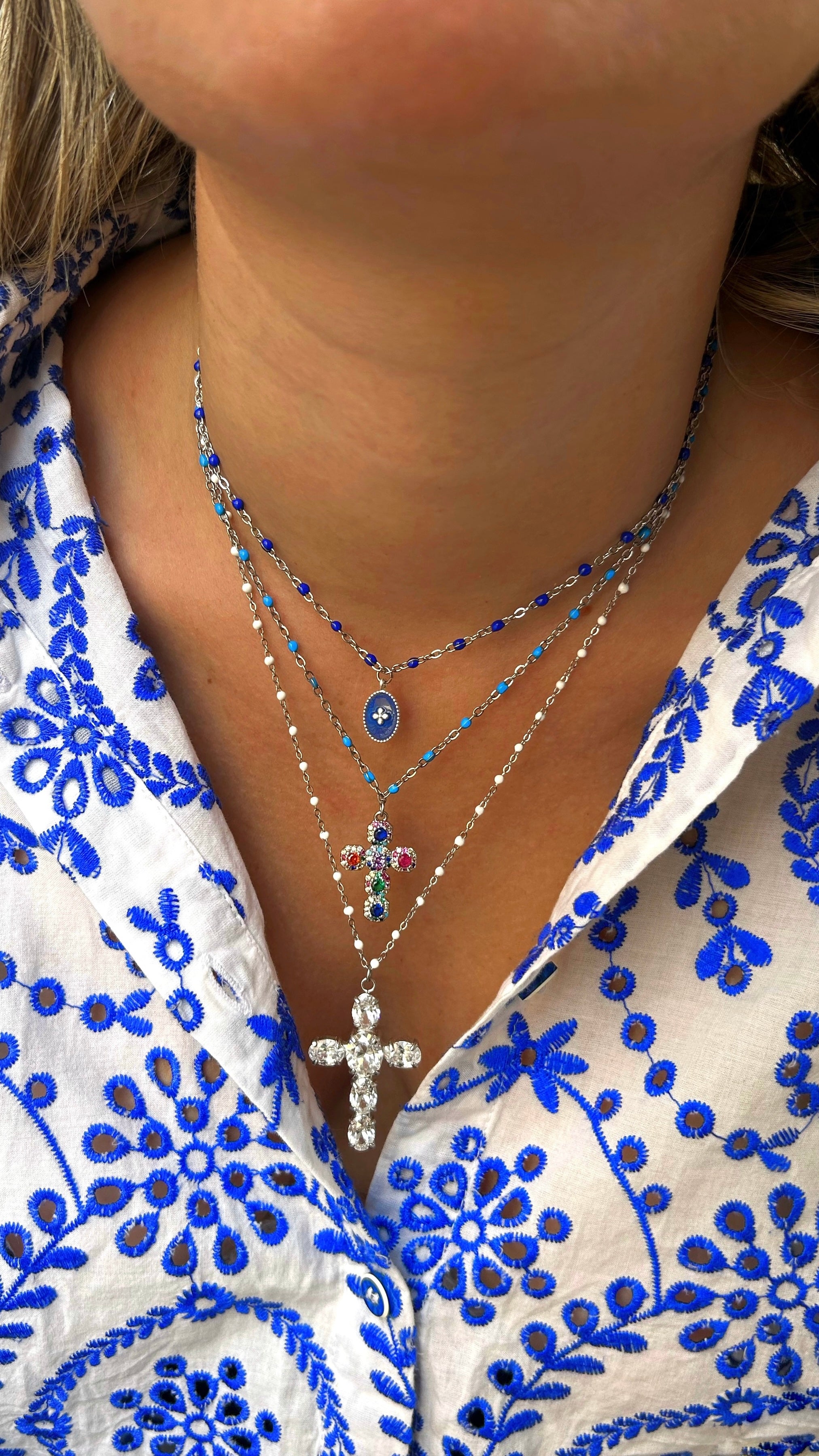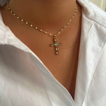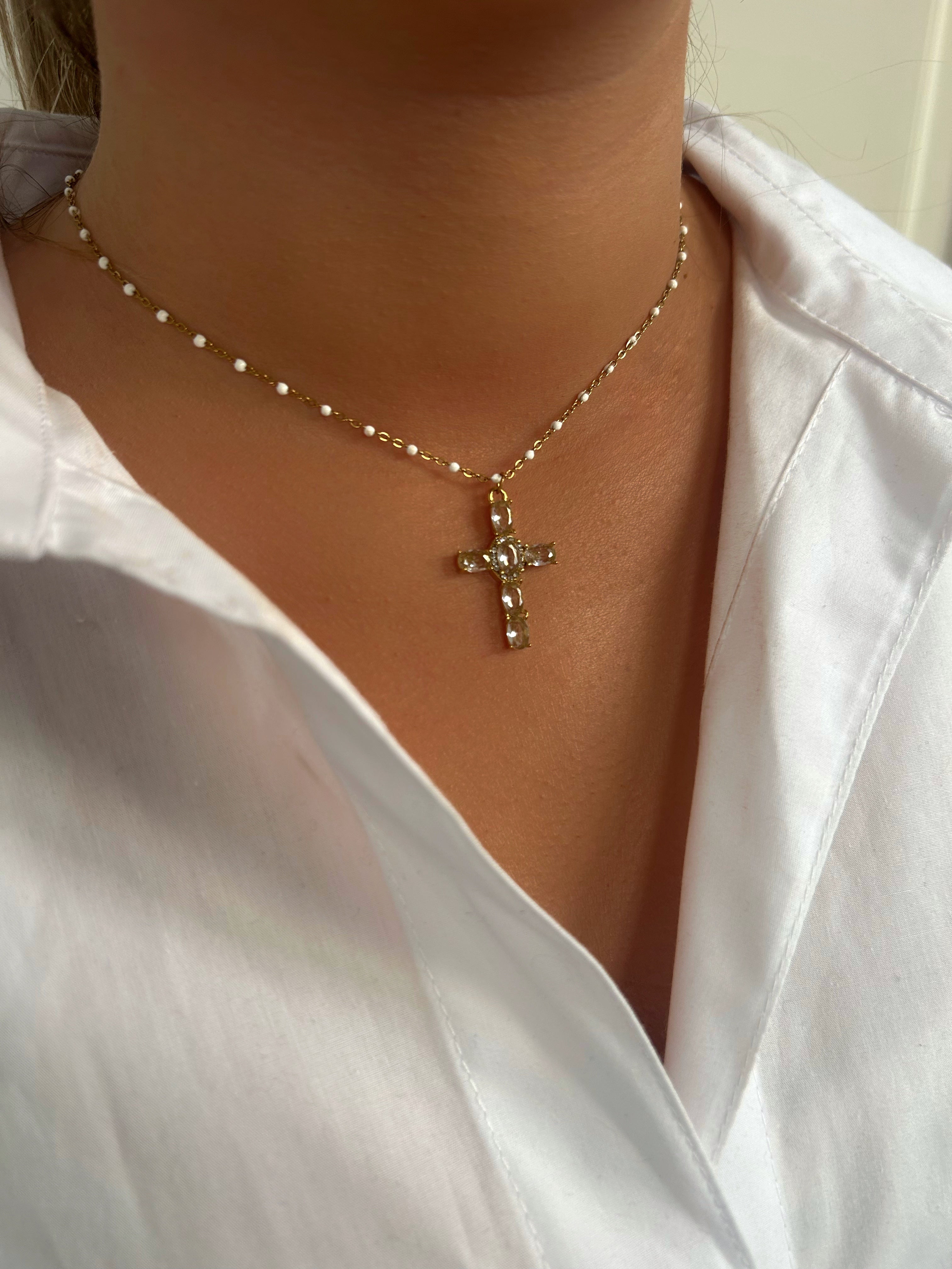 Collier à fines perles blanches ajustable avec un pendentif Croix orné de strass.