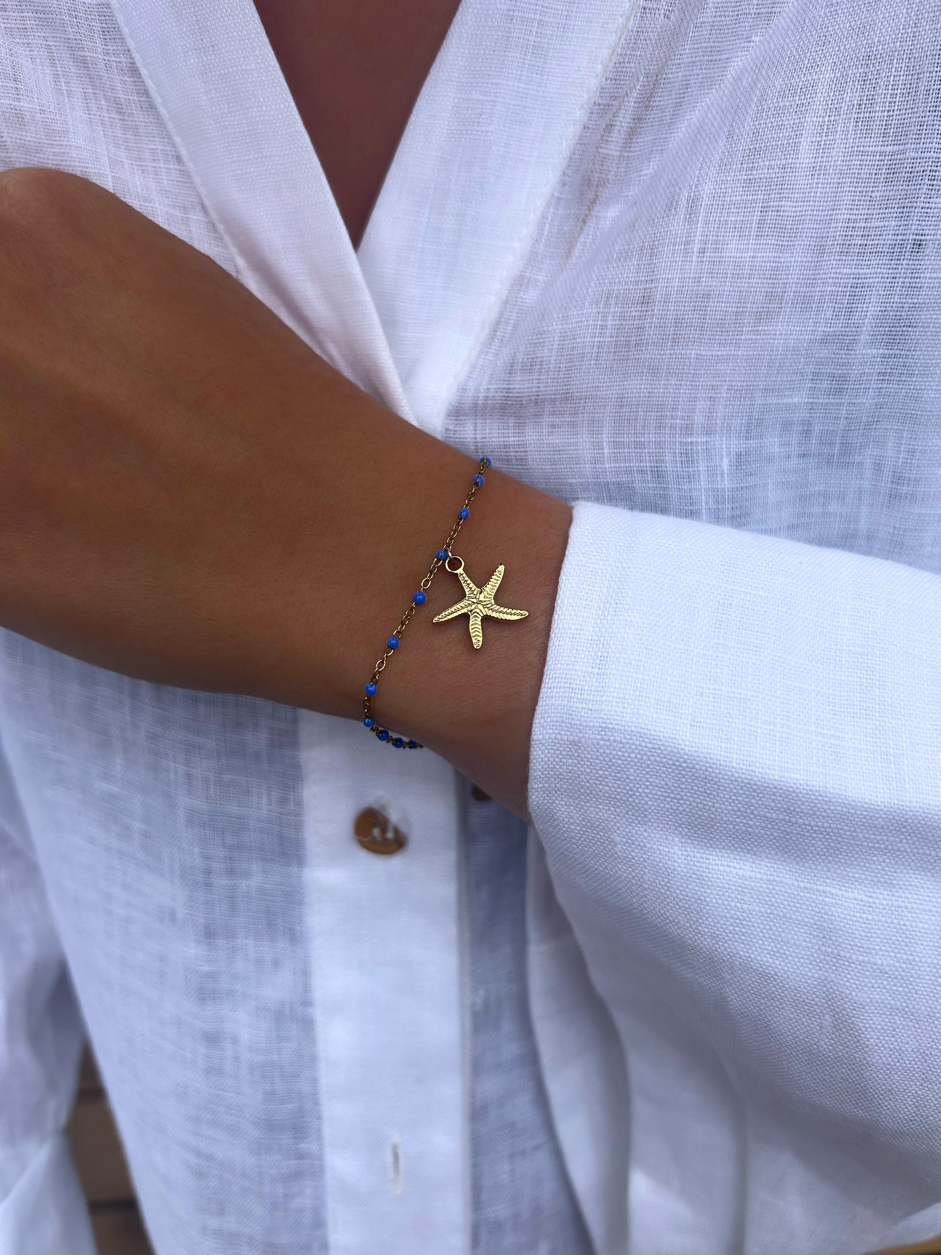 Bracelet à fines perles bleues ajustable avec un pendentif Étoile de mer.