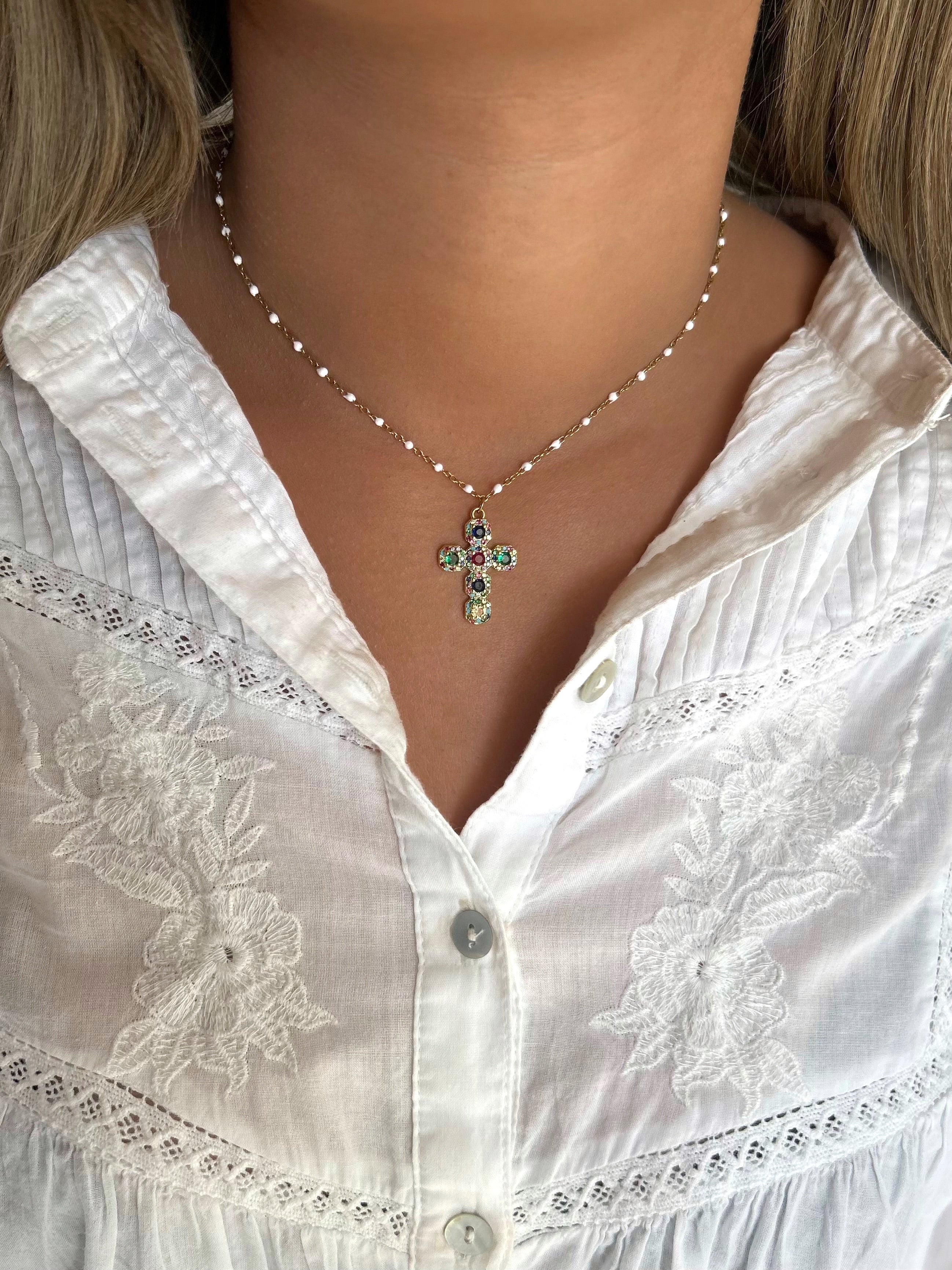 Collier à fines perles blanches ajustable avec un pendentif Croix orné de strass.