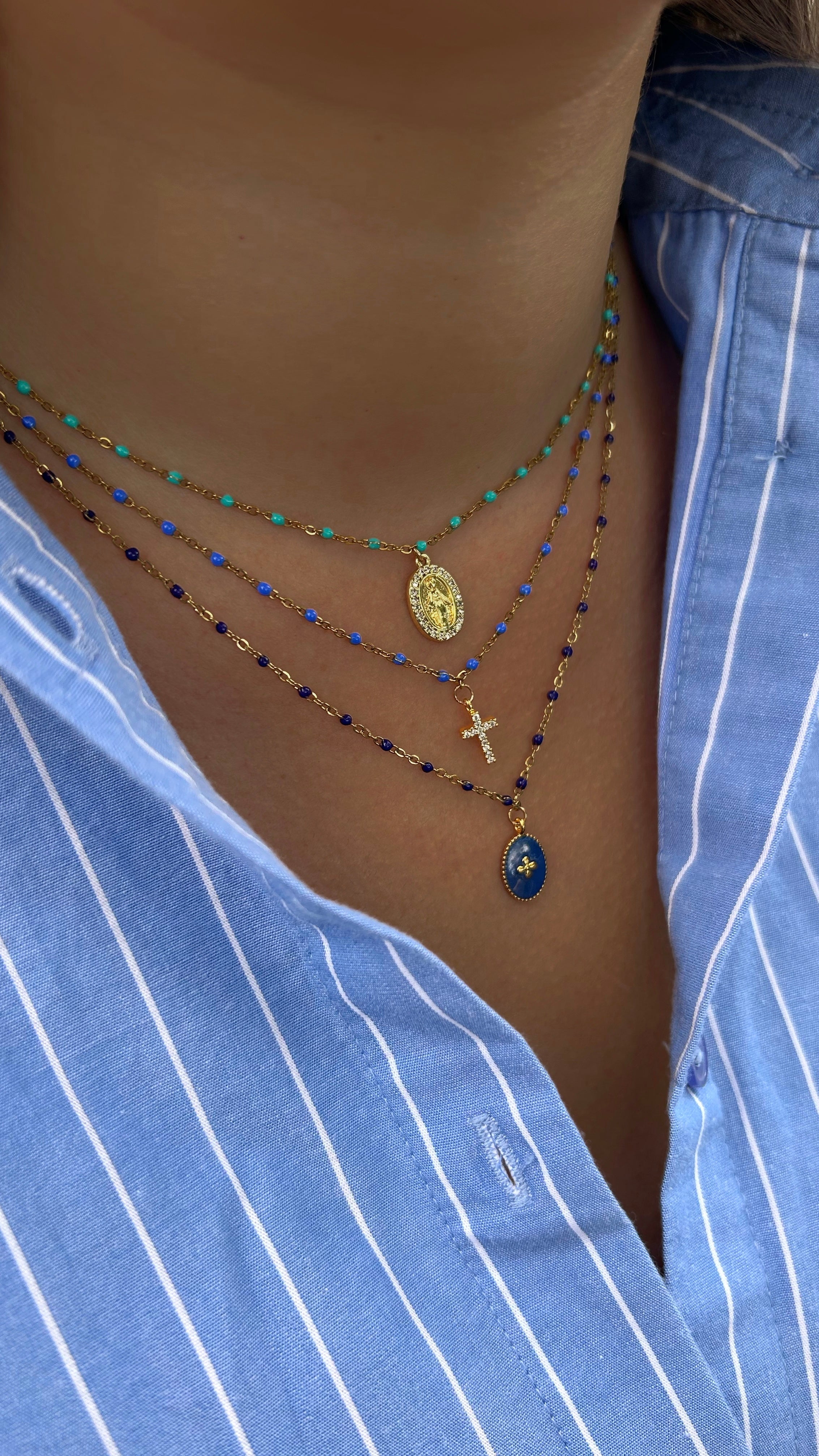 Collier à fines perles colorées ajustable avec un pendentif Croix orné de strass.