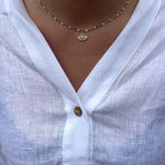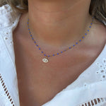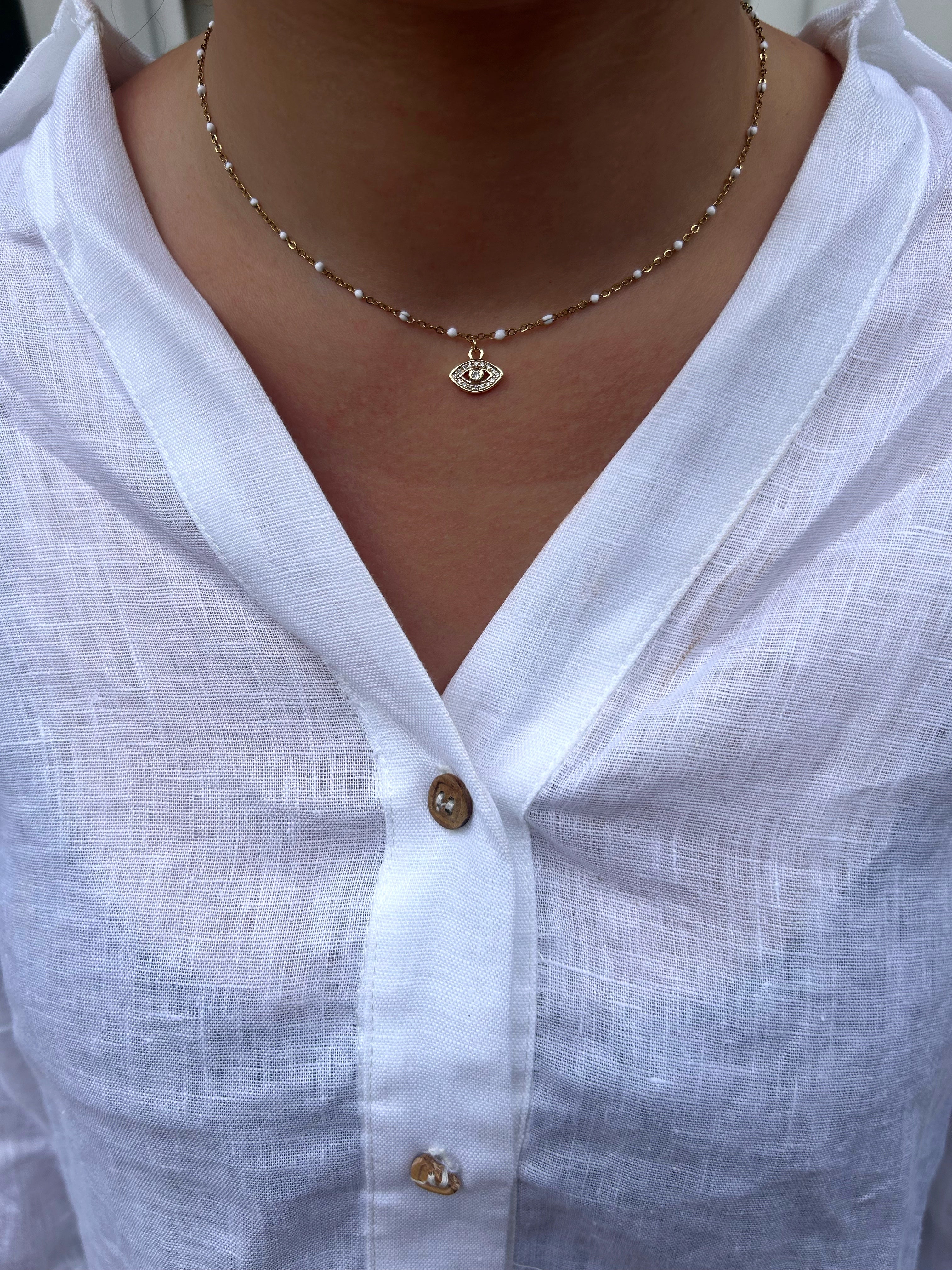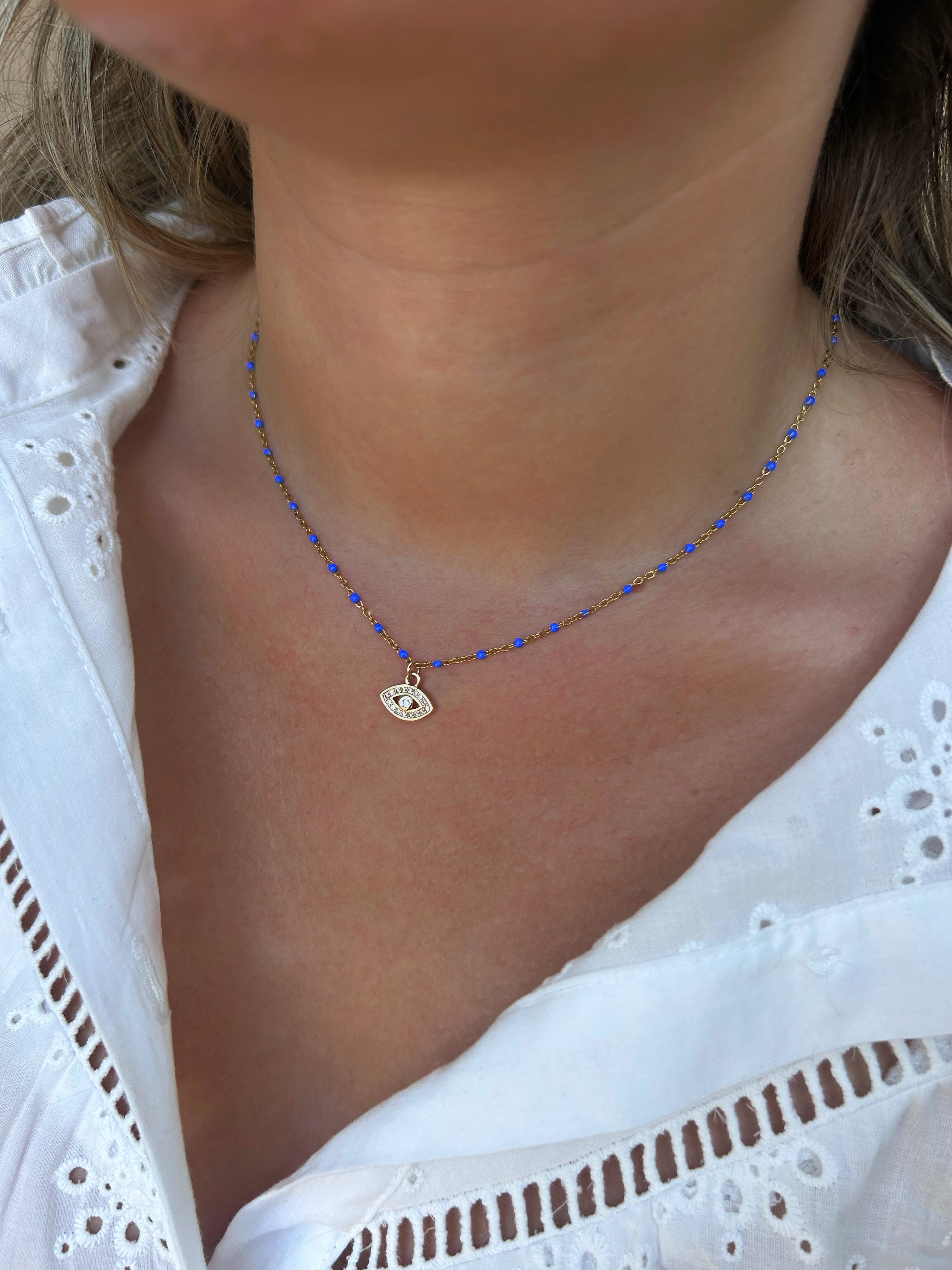 Collier à fines perles colorées ajustable avec un pendentif Œil orné de strass.