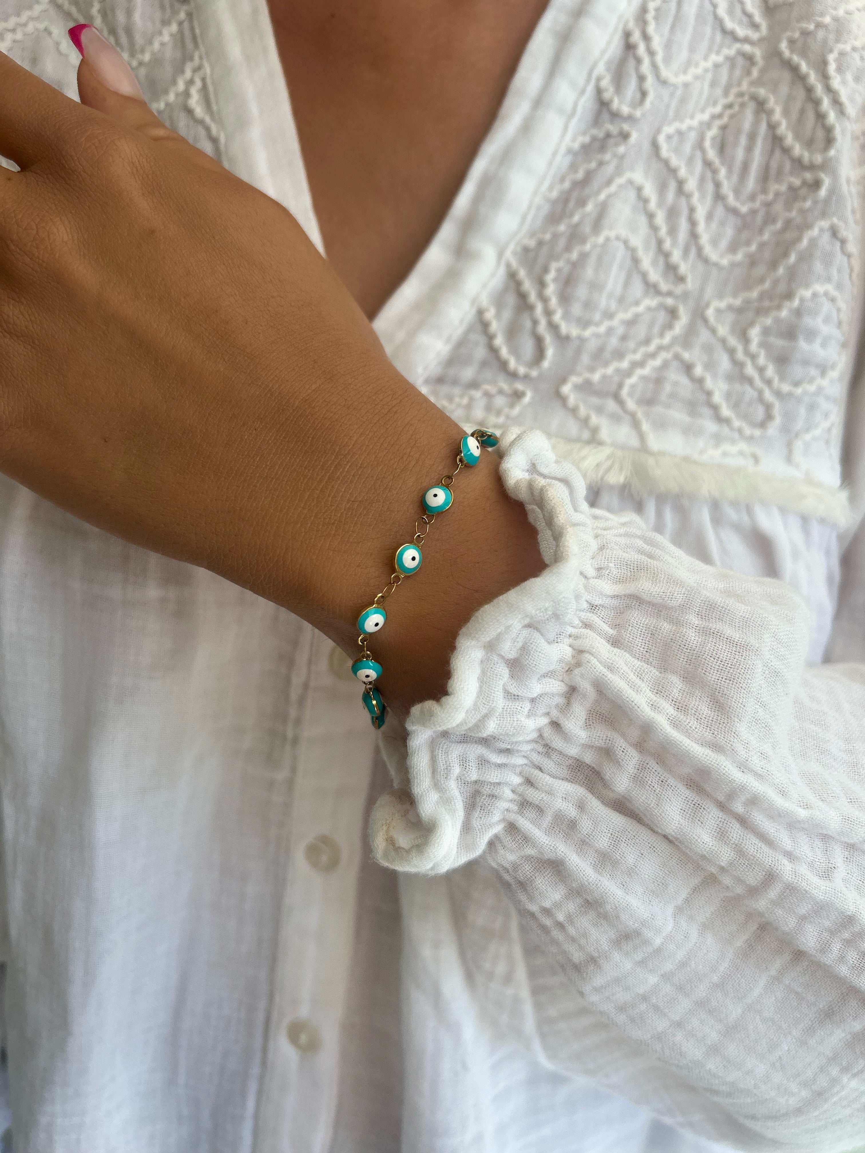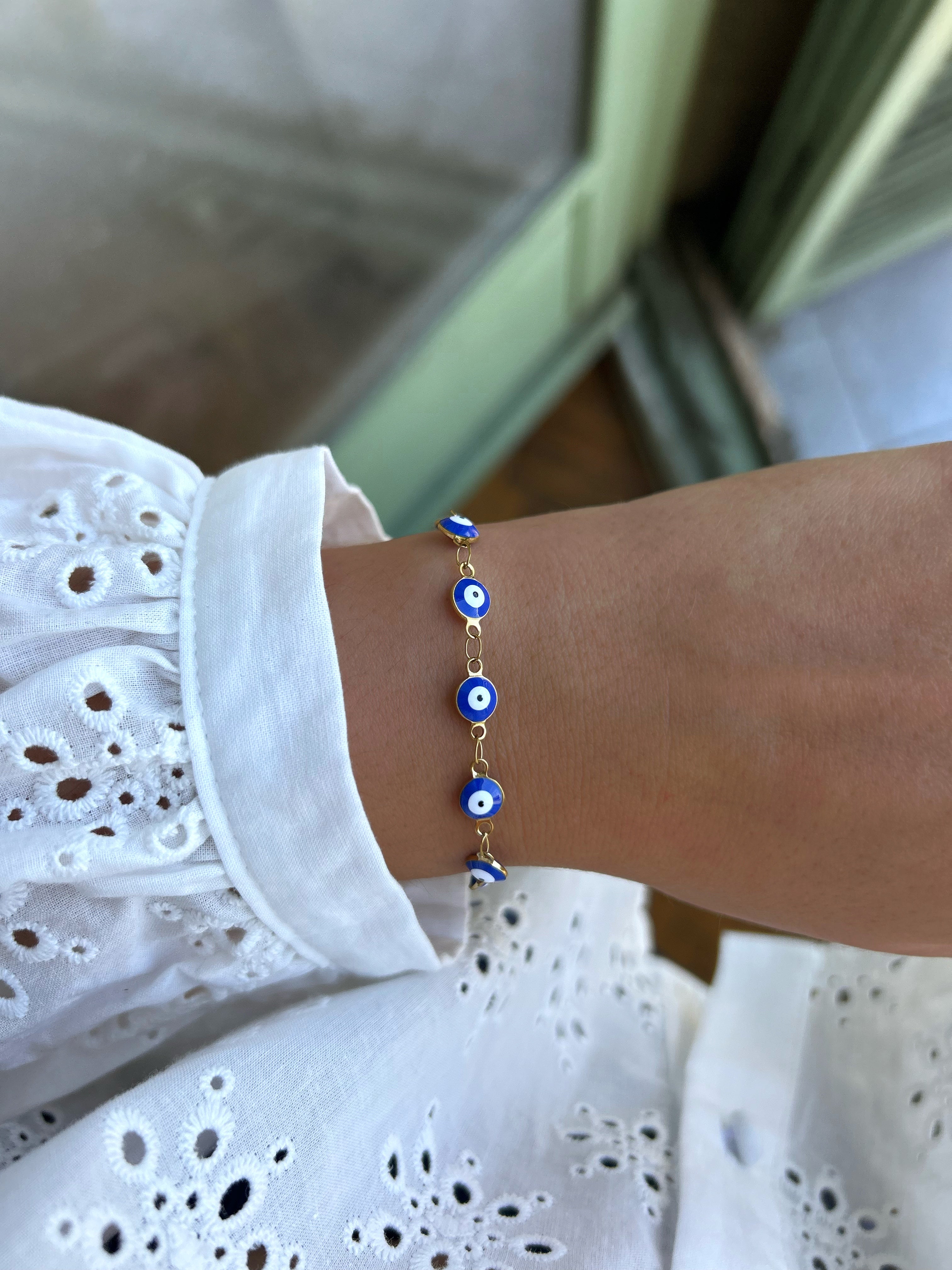 Pulsera de finas cadenas ajustables decorada con Ojos Griegos.